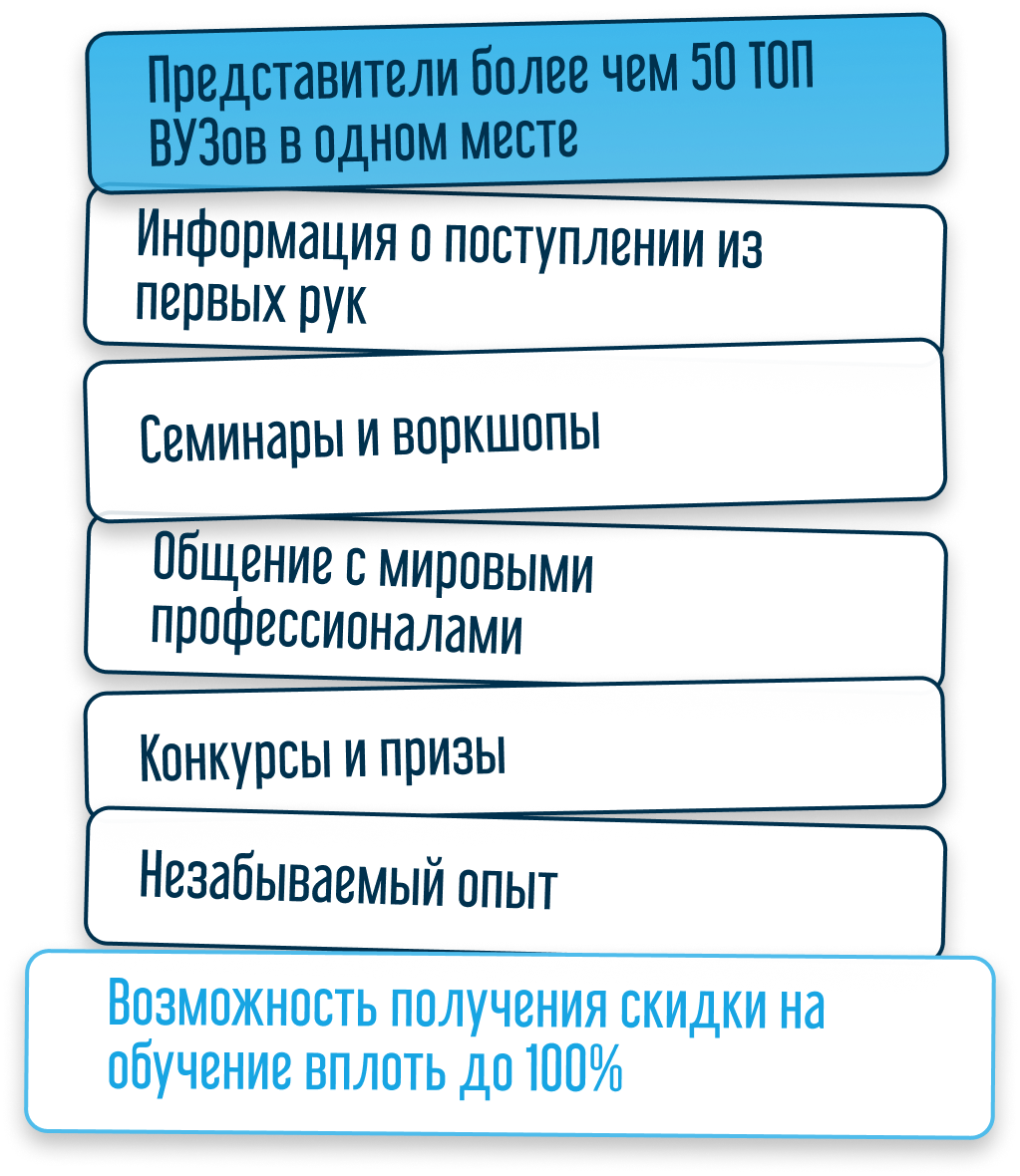Наша выставка представит вашему вниманию лучшие университеты мира, где вы сможете ознакомиться с правилами поступления напрямую от официальных представителей приемной комиссии.